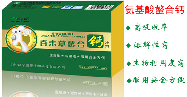 什么是螯合钙:百未草螯合钙是采用现代生物工程技术,将每两个氨基酸分子与一个钙离子在高压高频的特殊条件下精制而成。螯合钙分子结构稳定,钙原子与两个氨基酸分子中的氮原子以配位键相连,与羧基的氧原子以共价键相连,形成两个结构稳定的五圆环。这种特殊的螯合结构不仅使钙原子在胃肠内不易被酸碱影响,而且100%螯合钙能与小肠粘膜细胞膜上的谷胱甘肽共价结合,直接进入肠膜内被人体完全吸收。