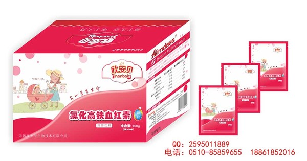 产品名称:欣安贝牌氯化高铁血红素冲剂(孕婴系列) 主要成分:血红素铁、维生素C等 食用方法:温开水冲饮,每次1包,每日2次 产品规格:5g/包 适宜人群:婴幼儿、孕妇、儿童等 保质期:18个月 贮藏方法:密封,置于阴凉干燥处 生产许可证:QS3708 0601 1336 执行标准:QB/T3623 建议零售价:108元/盒