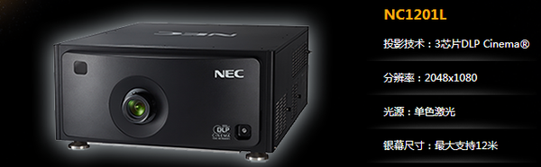 全球最亮内置激光光源数字电影放映机NEC 于2015 年推出采用激光光源和0.69 英寸芯片的全新小2K 放映机NC1201L,NC1201L 目前是市场上同级别中输出亮度最亮的内置激光光源放映机,拥有2 万小时的光源运行寿命、小巧的机身和高度灵活的安装性能、超低的静音效果、全密闭防尘的光路系统(含光学引擎和光源部分)以及独特的散热技术等诸多优点能够使得NEC 的NC1201L 更好地满足用户对中小银幕的放映需求。NC1201L 已于2015 年6 月正式通过DCI 认证。