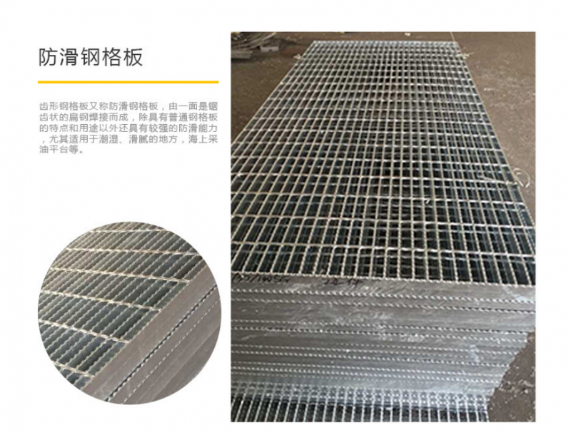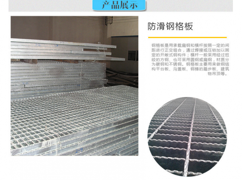 钢格板是用承载扁钢和横杆按照一定的间距进行正交组合,通过焊接或压锁加以固定的开敞式钢构件;横杆一般采用经过扭绞的方钢、也可采用圆钢或扁钢,材质分为碳钢和不锈钢。