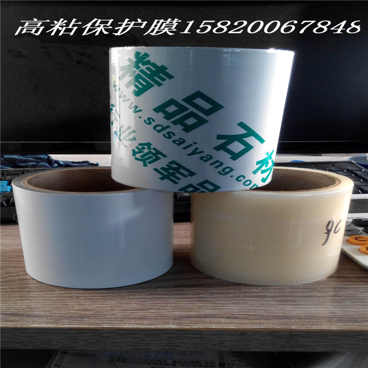 问题三:用户反映***多的就是保护膜产品的脱胶问题,这个问题在型材保护膜上体现***多,当用户把型材安装施工完毕以后把保护膜从型材表面撕下来的时候,保护膜表现的粘胶并没有随着保护膜,而是残留在了型材产品上,这是用户***不愿意看到的,因为这非常麻烦,需要专人把这些胶水从型材上刮下来,特别费工费时,出现这种问题有多种可能性,的可能就是保护膜产品用的压力胶不符合规定,也就是太粘了,导致PE保护膜产品在被剥离时,外张力大于内应力,而残留在了型材上。如果用户出现这种问题,可以用干净的抹布蘸取少许酒精,对残留的敏胶进行反复擦试,直到敏胶被擦试干净,不过需要注意的是在进行擦试的时候千万不要太用力,不然可能会影响型材产品的光洁度。