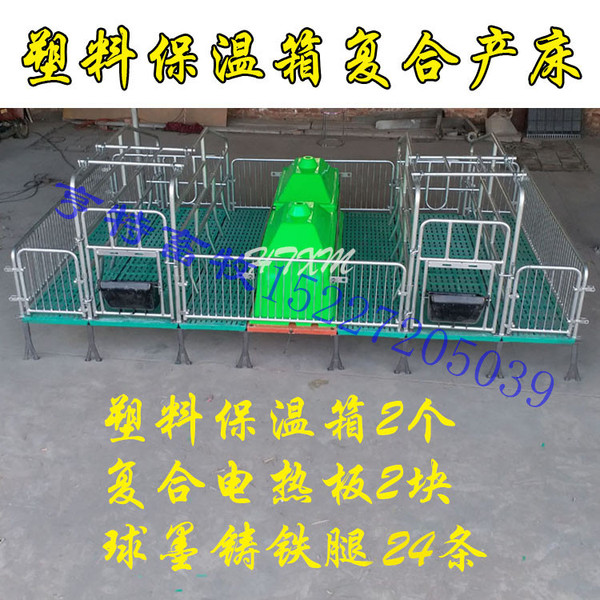 整体复合产床的尺寸是2200*3600.是由4块1100*600的复合板,8块1100*450的复合板,2块1100*600的电热板铺成的。2个复合保温箱,2个母猪钢板食槽,2个小猪不锈钢食槽。整体复合产床承重强,防滑,而且不伤害母猪乳头和小猪蹄子。或者,食槽,保温箱可以根据客户的需求加以调制。整体上架才有镀锌管2.0厚,全一寸钢管,耐腐蚀,耐用。