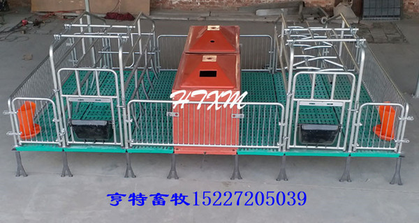 1、便于对母猪和猪仔的管理;母猪产床又称高培产仔栏,主要由母猪定位架、母猪产床仔猪围栏、仔猪保温箱、漏粪地板、母猪食槽和小猪补料槽等组成。 母猪定位架的作用是控制母猪自由活动区域和躺卧方式,定母猪产床位架之间有挡杠,避免仔猪被压死、踩死和压伤。定位架的长度一般为2.1-2.3米,宽度为0.6米,高度为1.0米。限位架最下边的一根栏杆上面焊有弯曲的档柱,用以保护仔猪,而不影响仔猪吃奶。母猪食槽和饮水器都在定位架的前方。