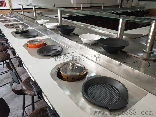 佛山市樵森回转火锅设备传送带速度为0-5米/分钟,速度可调节,自助火锅旋转设备链板为特制月牙形不锈钢链板,其设备安装后,业主可根据自身情况可进行装修,自动回转火锅桌餐台面可用大理石或实木装修,回转火锅设备 、火锅传送带还可根据业主餐厅布置的要求,来做不同形状,其价格合理,外观精美,无噪音等特点.