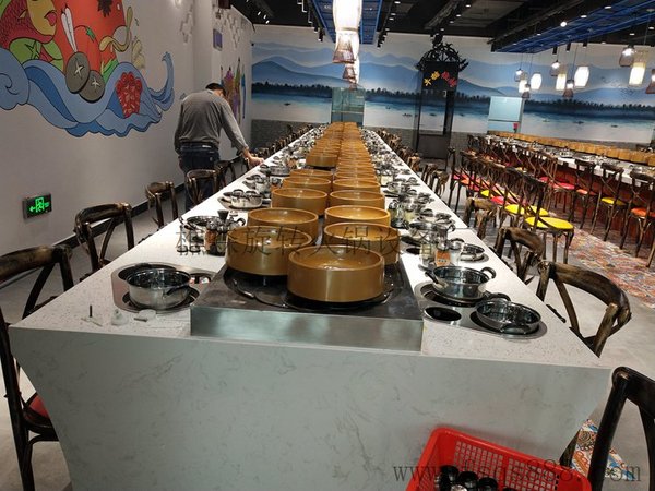 材质:回转火锅设备餐台台面的装饰材料可以选择人造石,大理石,金刚石等;台下墙裙的装饰材料可选择防火板,不锈钢板、马赛克、铝塑板木纤维板;进口台面树脂漆,防烫、防腐、耐磨。