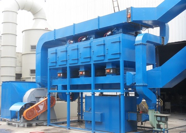 催化燃烧设备在工作时先将有机废气用活性炭吸附,当活性炭达到吸附饱和时停止吸附操作,然后在80~120℃的温度范围内使活性炭发生脱附;脱附下来的有机物浓度较原来提高几十倍并送入催化燃烧室进行催化燃烧反应,在贵金属催化剂表面于200~350℃条件下进行催化氧化反应,使其转化为无害的CO2和H2O。