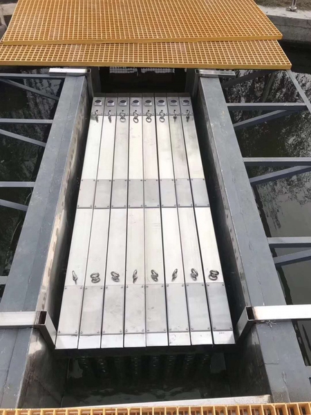 3、水渠在排架之前的部位应放置栏网或格栅,防止大件杂物进入JUVC紫外消毒模块设备,缠住和粘住排架上的气缸,导致气缸运行不顺。