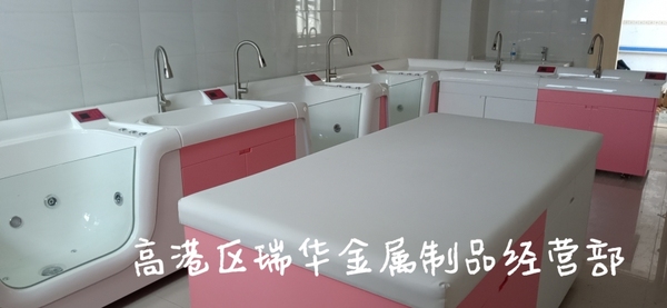 洗浴中心由洗礼池,游泳池,护理平台,抚触软包台,洗手池等组成。洗礼池和游泳池,洗手池,护理平台,转角平台都采用面层为优质的A级PMMA高分子复合材料一体成型,表面细菌残留量远远低于不锈钢,,陶瓷盆和其他普通塑料。婴儿洗澡池底部圆滑突起设计;给婴儿一防滑支撑点,防止婴儿在池内滑动,造成意外呛水。