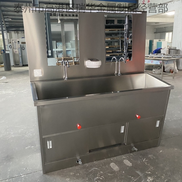 不锈钢洗手池材质特点:采用304不锈钢制作,一体化无焊缝池体,出水方式有:感应式、膝控式、脚踏式和手动开关,一台洗手池可客户要求选择单一出水方式或多种出水方式。洗手池分高背和低背,高背总高度1800mm,配有美容镜,照明灯,皂液器,可按客户要求配置烘手器和热水器。低背板无配置。