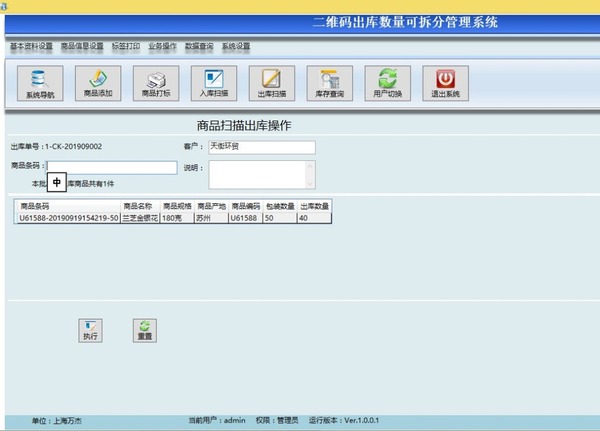 (1)扫描需要出库的商品(数量可拆分),扫描完毕后,点击执行按键,完成操作。如图示: