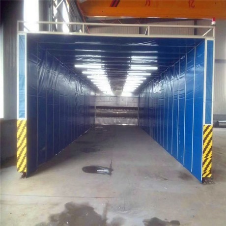 3、伸缩移动喷漆房整体为框架传动结构,每组框架间均有阻燃PVC布密封连接,安装快捷、外形美观,结构精巧,使用方便,制造成本低;