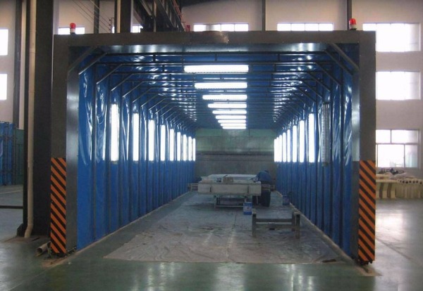 伸缩移动喷漆房整体为框架传动结构,每组框架间均有阻燃PVC布密封连接,安装快捷、外形美观,结构精巧,使用方便,制造成本低,节约投资!工作中房体沿地面铺设的轨道前后伸缩移动,采用两边分别驱动,互相连锁的方式运行,前后安全限位控制,机械运行安全稳定,操作简单,使用方便。工作区内安装有防爆照明灯,可满足生产中的照明需要!可根据客户的实际生产需要定做各种型号的非标尺寸;在无需进行喷漆流程的工作时间内,可将前室并拢,节省空间场地作为其他与喷漆交叉作业的工序所使用。