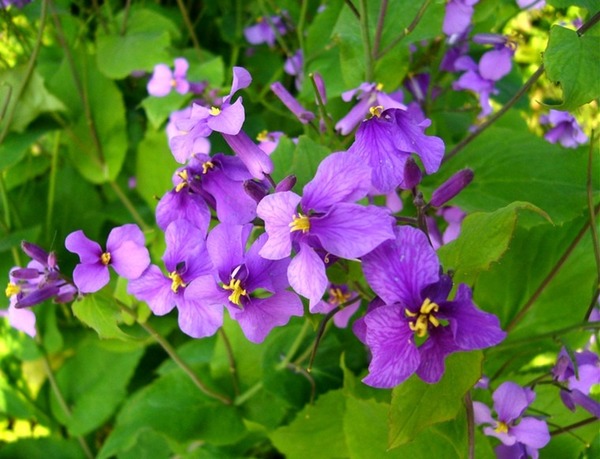 二月兰(学名:Orychophragmus violaceus (L.) O. E. Schulz)是十字花科,二月兰属一年或二年生草本植物,高可达50厘米,无毛;茎直立,基生叶及下部茎生叶大头羽状全裂,顶裂片近圆形或短卵形,侧裂片卵形或三角状卵形,叶柄疏生细柔毛;花紫色、浅红色或褪成白色,花萼筒状,紫色,花瓣宽倒卵形,密生细脉纹,长角果线形,种子卵形至长圆形,黑棕色。