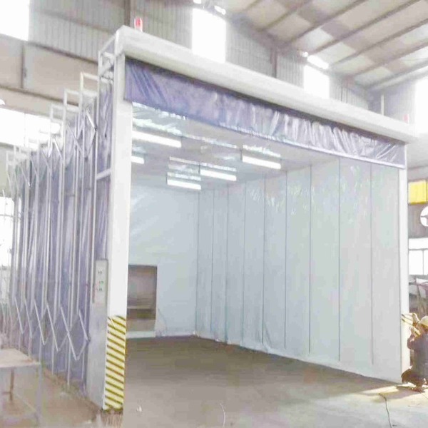 伸缩移动前室是本公司为解决重型工件移动难及工作区的综合利用而专门设计的。一般固定式前室遇到将重型工件移入移出的工序,对于需要用天车、台车搬运的工件就无法实现运输,而移动前室可克服此弊端。首先工件喷漆前通过电控柜控制移动前室收缩合拢,让出喷漆场地。待工件用天车安放就位后可控制移动前室打开至“罩”住工件即可,而不用再移动工件,这样可以完全不影响天车的工作。移动前室由几组可保持平行移动的框架及连接框架的段接蓬布组成。框架之间的滑动连接机构保证框架在驱动装置的带动下沿地面的轨道前后移动时保持竖直平行,同时带动蓬布展开合拢。移动前室收缩合拢时,将工件移入工作区,展开时可进行工件的喷漆。