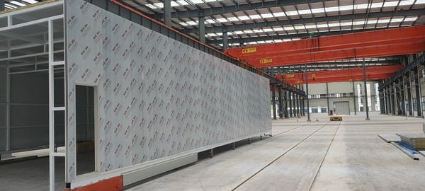 整体移动式喷漆房应用于大型工件的打磨或喷漆工作中,方便收集工作中产生的粉尘或废气。在一般情况下每套房体设设置有2-3个排风净化工位,哪个工位上的工件需要喷漆时,房体则行走移动到那个工位,其他工位可以继续打磨工作,待房体内的工件喷漆完毕后,再控制移动房体行走到打磨完毕的工件工位,如此设计可以实现大型工件的不间断连续喷漆工作。房体为钢结构构造,房体立柱下面设置有两台电动驱动行走机构,行走机构沿地面轨道行走。移动房体两端设置有电动卷帘大门,房体行走时,大门升起,待到达知定位置时,大门降落关闭。大门与行走机构由电气控制部分连锁控制,大门升起后,房体才可移动行走。