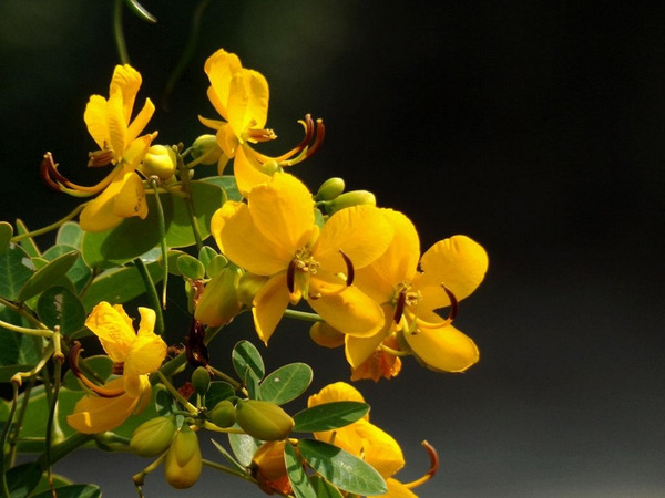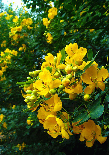 盆栽黄槐,10月开始开花,花期约2个多月,越冬落叶后进行换土,修剪,翌年5-6月又开始开花,花期约1个多月。