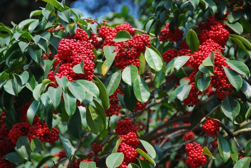 革质,两面无毛。花朵抽生,或簇生于叶腋间,形成聚伞状花序,雌雄异株,花期3—4月,盛开时,花冠呈现黄白色。花后坐果,浆果椭圆形,10—11月果实成熟,成熟的果实为深红色,果皮红光熠熠,极其美丽,具有较高的观赏价值。