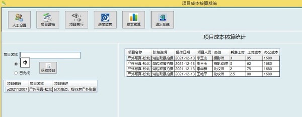 3、当项目完成时,自动汇总数据,进行成本核算统计操作