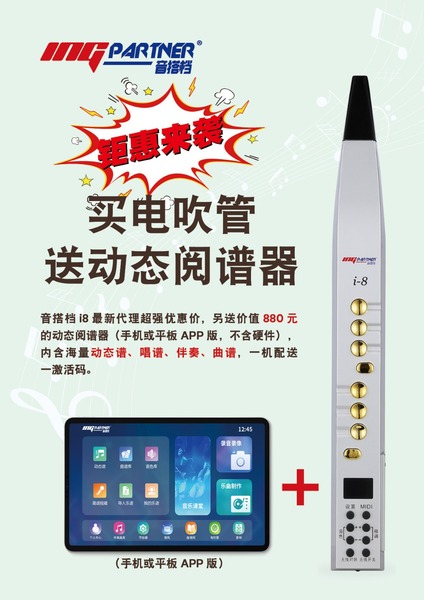 套餐一:音搭档电吹管新代理优惠价,另送价值880元的动态阅谱器(手机或平板APP版),内含海量动态谱、唱谱、伴奏、曲谱,一机配送一激活码。