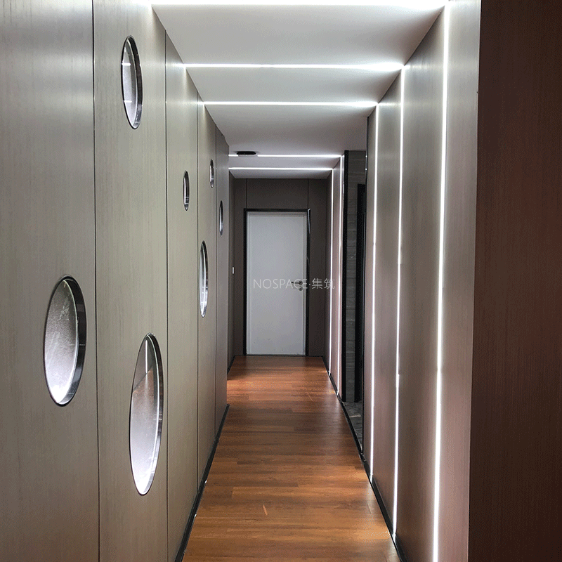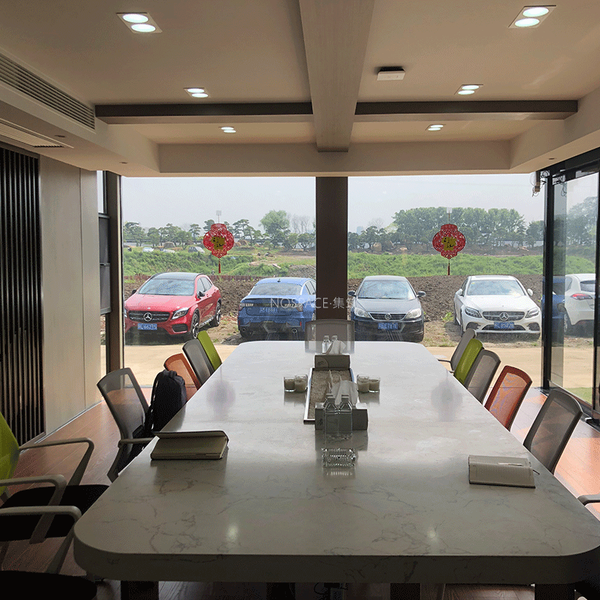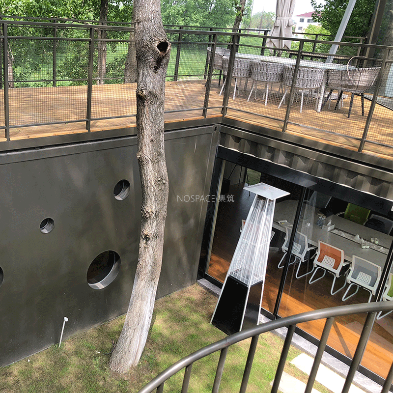 右侧为集装箱会议室(业主产品相关集装箱展厅展示中心),中间一个箱子包含了集装箱厕所,中间开了几个圆孔,透过圆孔给你撒到室内的阳关斑驳有致,正好对着原有的树木,有着别样的趣味;r