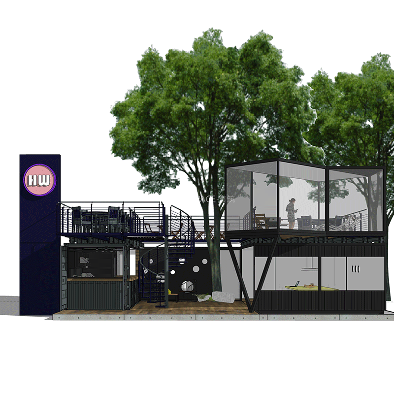 该项目位于江苏省的一个花木园内,业主想做一个集装箱办公室,我们做个初稿方案客户就比较满意,顺利定稿。 一层左侧为:集装箱奶茶吧搭配一个旋转楼梯上二层;