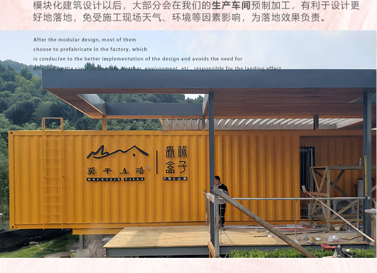 项目地点因土地性质原因,无法土建,只能以临时建筑的形式来做。滨江集团以集装箱为载体做的集装箱样板间,作为他们项目样板间的一个展示。箱体的宽度是已经超出运输规范,以及平台和雨棚等其他构件需要进行现场拼接安装。近年来,莫干山民宿的兴起,越来越多的客栈老板选择用集装箱作为客房。集装箱民宿因其施工速度快,外观效果好,游客住习惯了木屋等常规民宿,也想体验体验集装箱民宿。房地产公司更是用集装箱来做售楼部和样板间,对于他们新开发的项目,能快速建好售楼部和样板间向客户展示,锁定意向客户,也方便他们资金回笼。