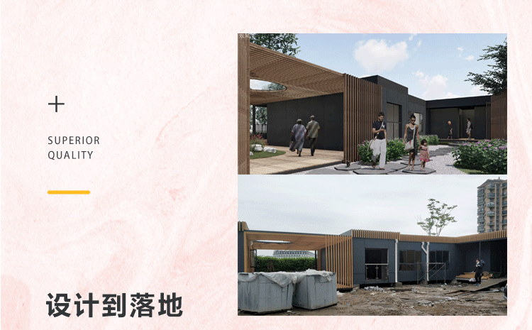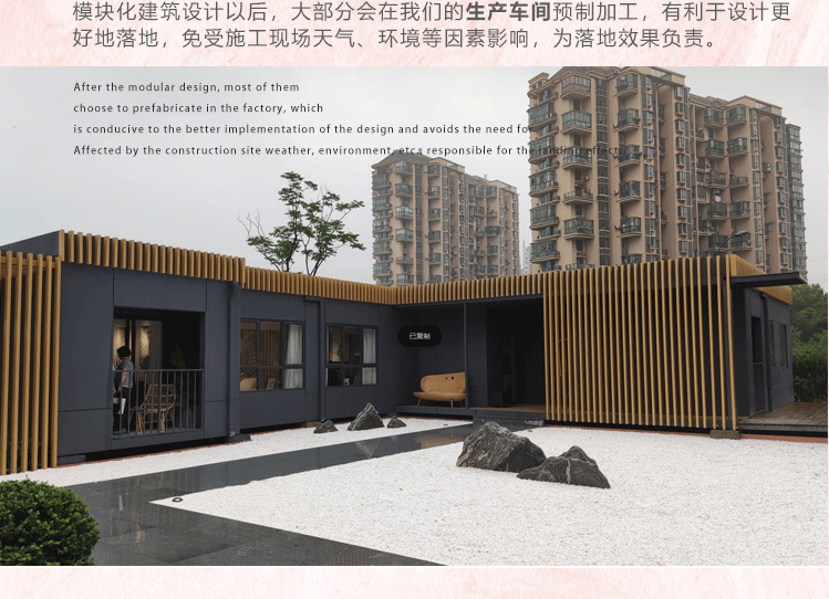 集装箱样板间体院采用了枯山水设计,以不变的静止去映照万事万物的永不停息。而这枯山水之中的主角就是"L"型的集装箱建筑,整个建筑由一个80㎡的户型和一个140㎡的户型构成。各个集装箱之间拼接工艺成熟。加上木栅和水泥板装饰,从外面看几乎浑然一体,绿化前枯后荣,疏密有致,整体建筑从设计到落地只用了30天,充分发挥了装配式建筑的效率优势。