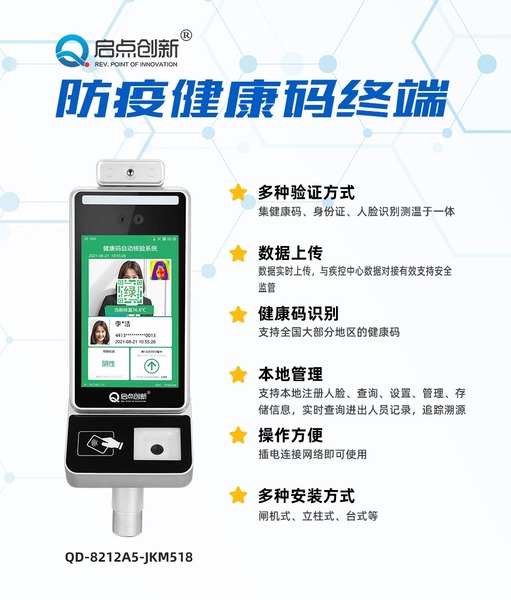 健康码人脸识别一体机对接了全国政务平台以及各地大数据平台,能够读取、核验居民个人健康码状态、14天动态行程码、核酸检测结果、疫苗接种信息等,支持刷身份证、社保卡、二维码核验,快速筛查中、高风险地区人员,实现高效防疫。