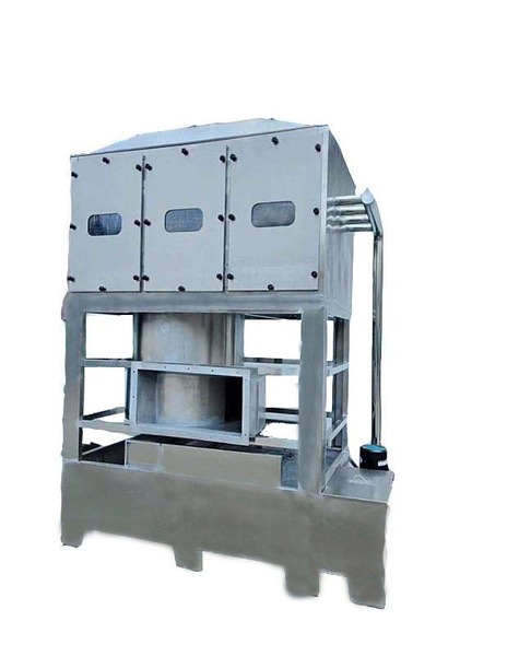 产品采用流体力学技术,避免水泵及喷头的堵塞,大大提高生产效率,其中水池的水可循环使用,避免产生二次污染造成的困扰,更节约了水资源;气旋塔内安装有若干个“圆形旋流桶”和除雾板。旋流桶内放有实心填料球,上层的除雾板用来净化水雾,达到脱水雾的目的,含尘气体在塔内旋流上升、并在各板上与由塔顶进入的液体旋流接触,完成除尘任务;通过离心力的作用,废气中的大颗粒沉入水池, 之后由人工捞出清理机壳,这样气体得到净化,达标排放,同时气旋塔内的水可以继续循环使用。