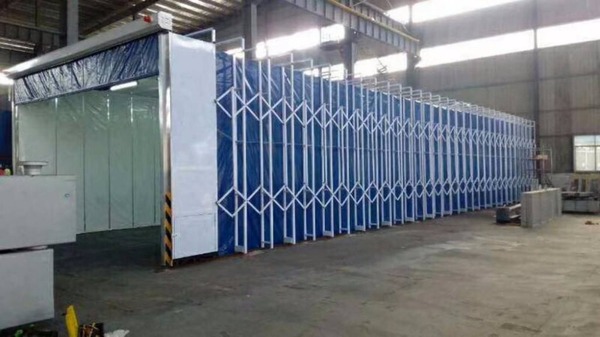 伸缩移动喷漆房整体为框架传动结构,每组框架间均有阻燃PVC布密封连接,安装快捷、外形美观,结构精巧,使用方便,制造成本低,节约!工作中房体沿地面铺设的轨道前后伸缩移动,采用两边分别驱动,互相连锁的方式运行,前后安全限位控制,机械运行安全稳定,操作简单,使用方便。工作区内安装有防爆照明灯,可满足生产中的照明需要!可根据客户的实际生产需要定做各种型号的非标尺寸;在无需进行喷漆流程的工作时间内,可将前室并拢,节省空间场地作为其他与喷漆交叉作业的工序所使用。