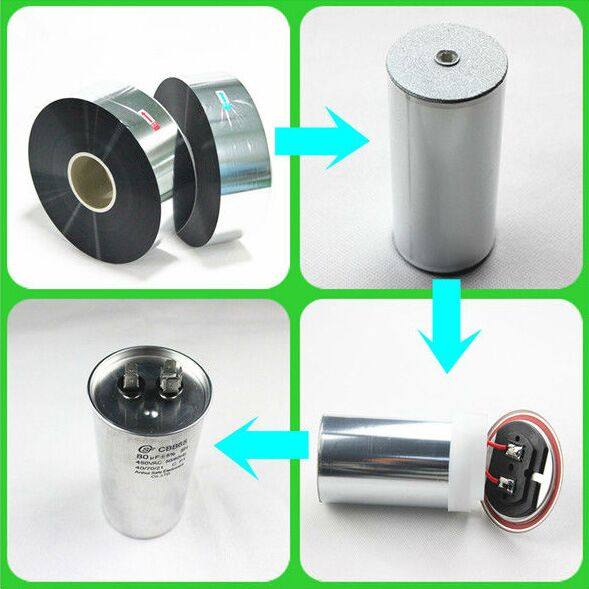 cbb65电容器采用边缘加厚的金属化锌铝膜作为电极和介质,该膜经过卷绕机卷绕后装入铝质外壳。