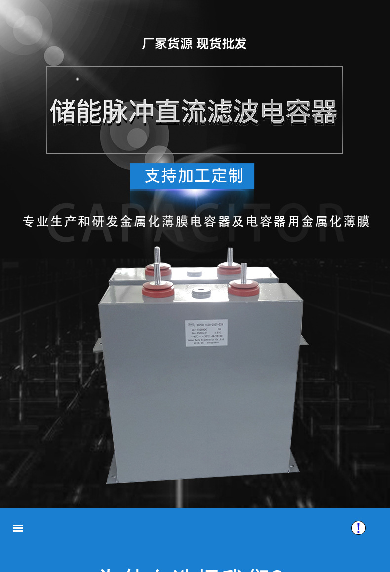 “赛福牌” 金属化薄膜脉冲脉冲(储能)电容器能够在较长时间内充电,而在极短时间内放电,从而形成一个巨大的脉冲功率。