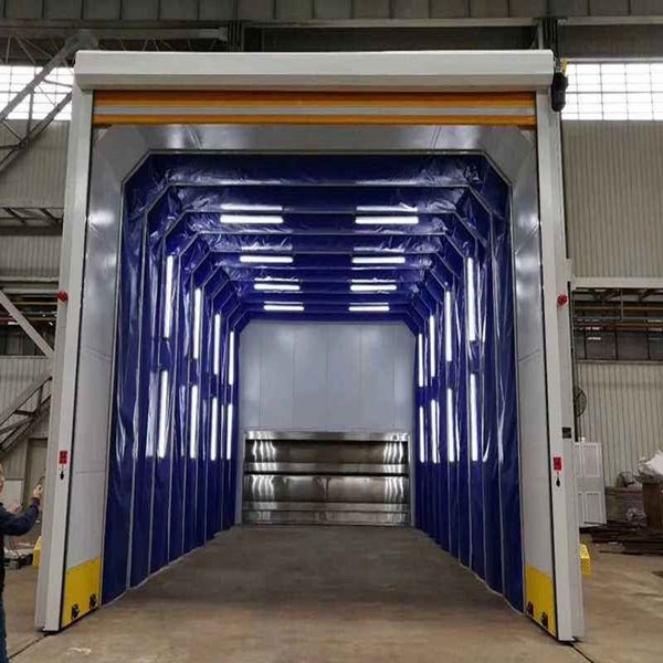伸缩式喷漆房由伸缩式喷漆房和干式喷漆柜两部分组成。其长宽高可以根据客户要求设计和制作。伸缩式喷漆房通称伸缩房。伸缩房的结构包括伸缩移动房体、伸缩轨道、照明系统、伸缩警示系统、电控系统组成。移动房体由驱动龙门架、从动伸缩架、伸缩连杆组成。