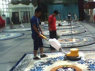 5、干泡刷洗:用装有水器、地毯刷的单盘扫地机,以干泡刷洗地毯。等清洁剂对地毯产生作用一会后,在重复刷洗工作。