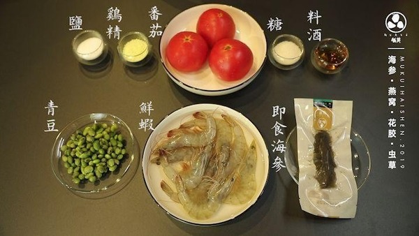 原料:番茄、鸡精、盐、料酒、糖、青豆、鲜虾、即食海参