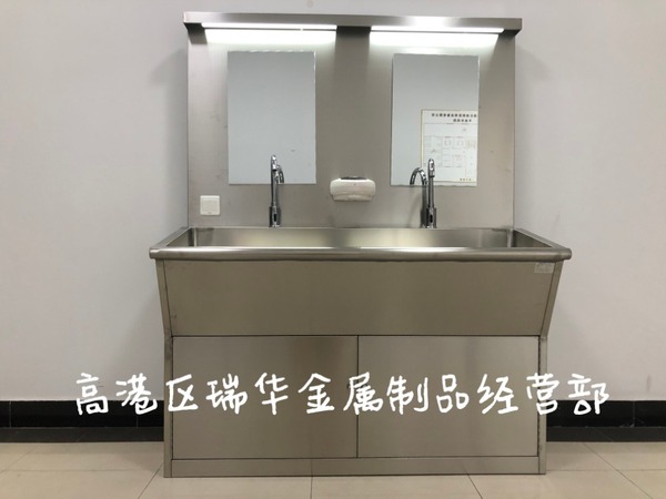 采用304不锈钢制作,一体化无焊缝池体,出水方式有:感应式、膝控式、脚踏式和手动开关,一台洗手池可客户要求选择单一出水方式或多种出水方式。洗手池分高背和低背,高背总高度1800mm,配有美容镜,照明灯,皂液器,可按客户要求配置烘手器和热水器。低背板无配置。