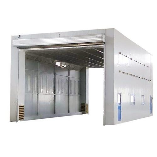 整体移动喷漆房主要用于大型工件的打磨或喷漆,便于收集工作中产生的粉尘或废气。一般情况下,每套房配有2-3个排气净化站。当哪个工位上的工件需要喷漆时,房间移动到那个工位,其他工位可以继续抛光。当室内的工件涂漆后,控制移动室移动到抛光工件工位。这种设计可以实现大型工件的不间断连续涂装。房屋为钢结构,房屋的立柱下有两个电动行走机构,行走机构沿地面轨道行走。移动房两端安装电动卷帘门。当房间行走时,门上升,当房间到达位置时,门着陆并关闭。门和行走机构由电气控制部分连锁控制,只有门升起后,房间才能移动和行走。