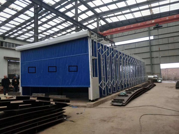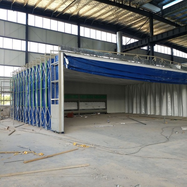 喷漆房后部采用防火岩棉夹芯板(可更换为镀锌板制作)作为底板,并合理设置多个吸风口,喷漆房内漆雾能有效进入后道废气处理装置。伸缩式喷漆房采用活动式框架结构,内衬玻璃纤维防火篷布,通过进出口门头处的驱动电机,通过轨道带动整体结构进行伸缩运动;非工作时间可将喷漆房整体折叠,节省了车间场地,作业时根据实际情况调节入口处卷帘,控制补风,从而提高作业时产生漆雾的回收效果。