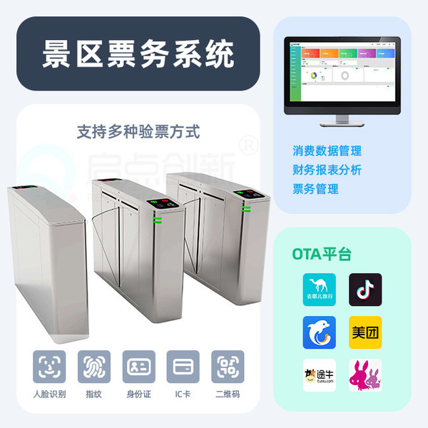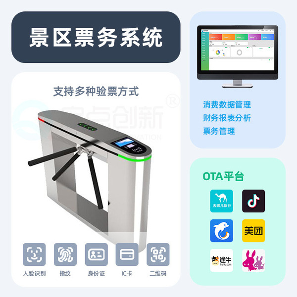 提供3类验票设备(智能闸机通道、手持验票机、立柱式验票机),支持多种验票方式(二维码、指纹、身份证、人脸等),方便游客快速检票入园。
