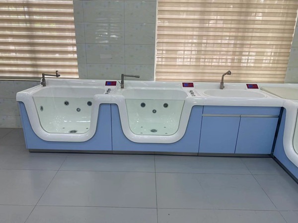 迪新婴儿洗浴中心拥有良好的台面质感,细腻亲切,无冰冷感,全弧形造型设计给婴儿体贴的呵护与关怀,洗礼池和游泳池特有的裙边设计,既方便固定一次性防交叉感染隔膜袋,又防止台面上污水流入池内。游泳池利用有效的水平面积提供更加理想的池内净深度,满足婴幼儿洗浴时的安全高度需要,同时有效保持水温特别设置水位线,防止婴儿游泳时池水外溢。