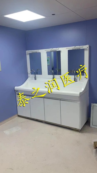 高分子洗手池材质特点:采用高分子材料一次吸塑成型,出水方式有:感应式、膝控式、脚踏式和手动开关,一台洗手池可客户要求选择单一出水方式或多种出水方式。洗手池分高背和低背,高背总高度1800mm,配有美容镜,照明灯,皂液器,可按客户要求配置烘手器和热水器。低背板无配置。