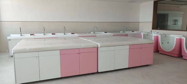 产品介绍:婴儿洗浴设备常见于妇幼保健院,医院产科,月子中心,母婴会所等,为刚出生的宝宝提供优良的洗浴环境。此产品为定制产品,需根据房间尺寸定制方案。、婴儿洗浴中心由婴儿洗礼池,婴儿游泳池,护理平台,扶触软包台,洗手池等组成。洗礼池和游泳池,洗手池,护理平台,转角平台都采用面层为优质的A级PMMA高分子复合材料一体成型,表面细菌残留量远远低于不锈钢,人造石,陶瓷盆和其他普通塑料。婴儿洗澡池底部圆滑突起设计;给婴儿一防滑支撑点,防止婴儿在池内滑动,造成意外呛水。