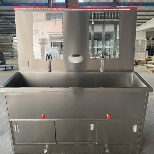 采用304不锈钢制作,一体化无焊缝池体,出水方式有:感应式、膝控式、脚踏式和手动开关,一台洗手池可客户要求选择单一出水方式或多种出水方式。洗手池分高背和低背,高背总高度1800mm,配有美容镜,照明灯,皂液器,可按客户要求配置烘手器和热水器。低背板无配置。