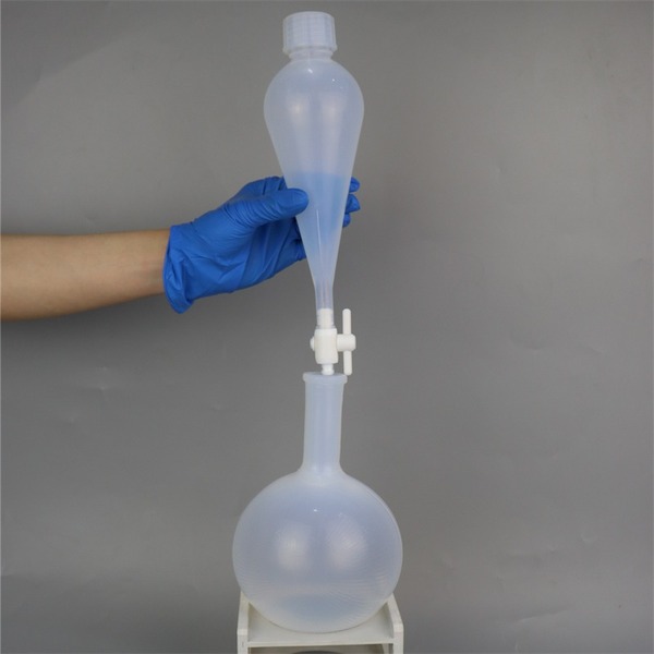 PFA也称可溶性聚四氟乙烯、特氟龙(Teflon),用于痕量分析、同位素检测,ICP-MS/OES/AAS分析等实验。PFA分液漏斗主要用于固液或液体与液体反应实验,控制所加液体的量及反应速率的大小以及物质分离提纯,对萃取后形成的互不相溶的两种液体进行分液