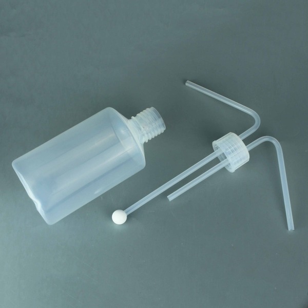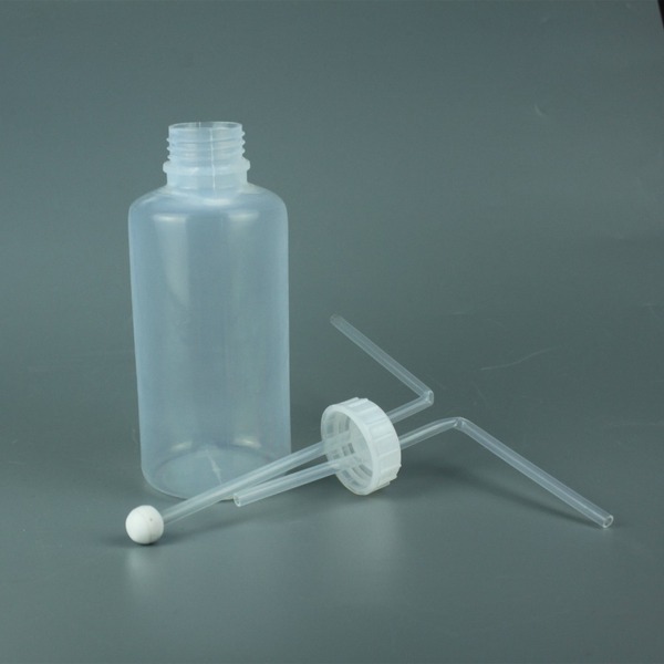 PFA洗气瓶是一种洗去气体中杂质的器皿,是将不纯气体通过选定的适宜液体介质鼓泡吸收(溶解或由于发生化学反应),从而洗去杂质气体,以达净化气体的目的。在设计时,四氟球的周围都布满小孔。一般情况下,长导管进,短导管出。