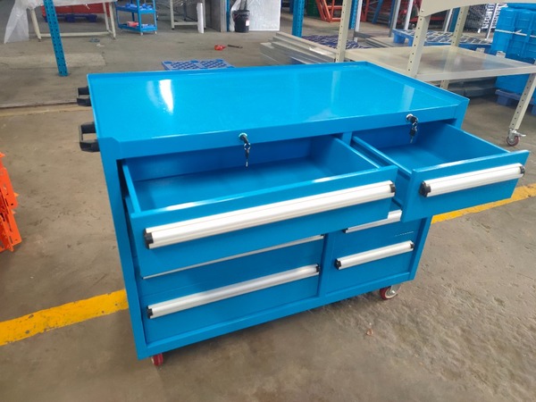 8、工具柜柜顶可选配置物框,内衬有防油胶垫,保护柜顶和物品。