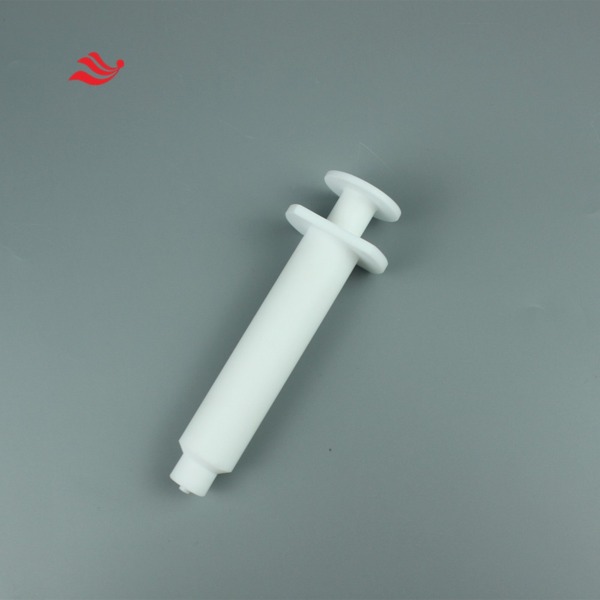 四氟注射器用于抽取或者注入气体或者液体,四氟注射器由前端带有小孔的针筒以及与之匹配的活塞芯杆组成,用来将少量的液体或其注入到其它方法无法接近的区域或者从那些地方抽出,在芯杆拔出的时候液体或者气体从针筒前端小孔吸入,在芯杆推入时将液体或者气体挤出。