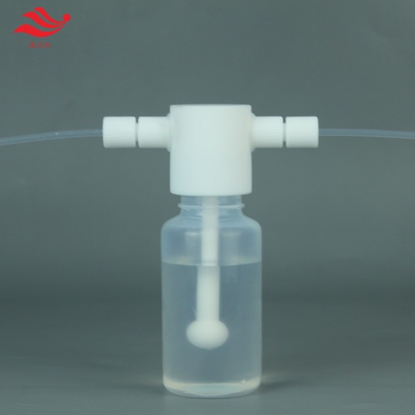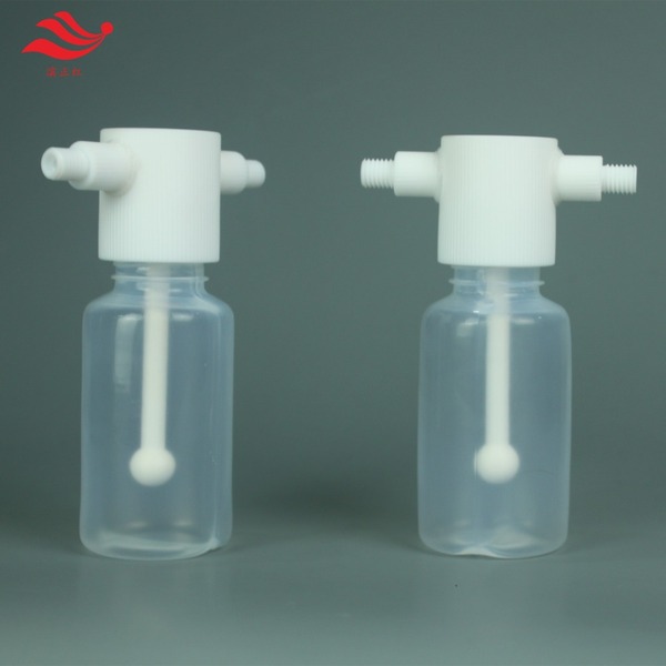 PFA洗气瓶是一种洗去气体中杂质的器皿,是将不纯气体通过选定的适宜液体介质鼓泡吸收(溶解或由于发生化学反应),从而洗去杂质气体,以达净化气体的目的。在设计时,四氟球的周围都布满小孔。一般情况下,长导管进,短导管出。