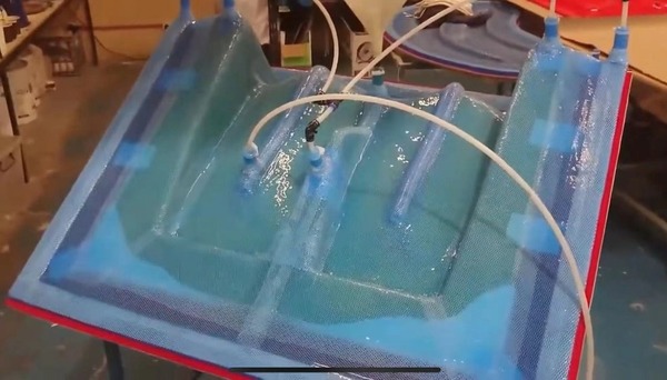 在复合材料真空导入工艺中,需要借助辅助材料成型,液体硅胶做成一层硅胶胶衣预铺在模具上,并利用真空体系将空气抽出,在模具型腔中形成一个负压,压力则会在预铺的管路压入纤维层中,让树脂浸润坛强材料,然后充满整个模具,从而得到所需的制品。