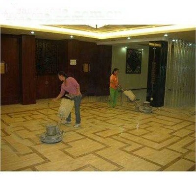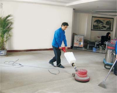 5、干泡刷洗:用装有水器、地毯刷的单盘扫地机,以干泡刷洗地毯。等清洁剂对地毯产生作用一会后,在重复刷洗工作。
